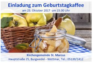 Das Geburtstagskaffeetrinken für die Junilarinnen und Jubilare der Monate Juli, Ausgust, September und Oktober findet am 25.10. um 15.00 Uhr im Gemeindehaus statt.