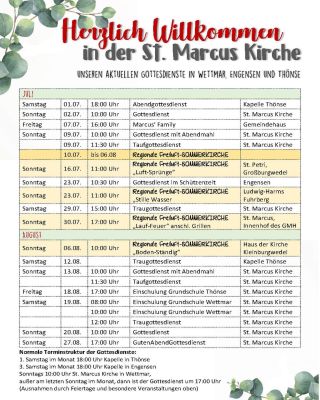 Am 30.07. findet die Sommerkirche dann auch bei uns in Wettmar, in Sankt Marcus, statt. Um 17 Uhr beginnt der Gutenabend Gottesdienst und im Anschluss grillen wir gemeinsam.