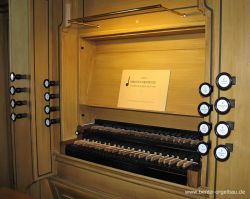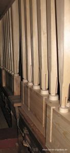 *) Bordun 16 Fuß konnte aus Platzgründen nur von G ab gebaut werden. Viola di Gamba 8 Fuß wurde bis G gebaut und erst ab Fis mit Lieblich Gedact zusammengeführt. Der im Kostenanschlag von Engelhardt vorgesehene Platz für eine Posaune 16 Fuß im Pedal wurde im Rahmen der Restaurierungsarbeiten damit besetzt.