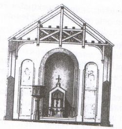 Die erste große Kirche dient der Gemeinde bis zum Jahre 1624. Raubende, mordende und brandschatzende Horden vernichten das Gebäude.